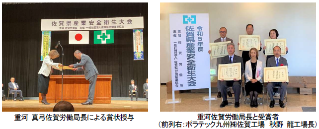 ポラスグループ ポラテック九州(株)(本社:佐賀県唐津市、代表取締役:中内 晃次郎)が、令和5 年度「安全衛生に係る佐賀労働局長表彰」において、【奨励賞(安全確保対策)】を受賞し、10 月5 日に開催された佐賀県産業安全衛生大会にて表彰されました。