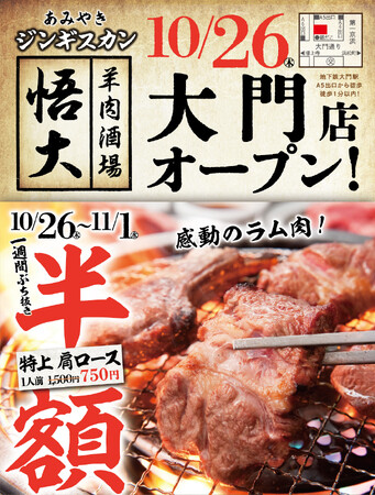 なお、出店を記念して10月26日(木)~11月1日(水)の7日間限定でオープンキャンペーンを実施。看板メニューの「生ラム肉の特上肩ロース」を半額の750円(税込)で提供します。