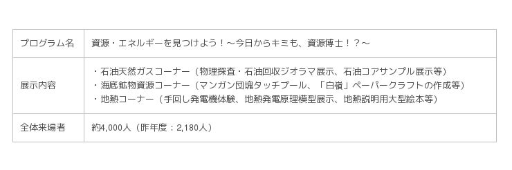 2日間のイベントで昨年を大きく上回る約4,000人にご来場いただき、JOGMECブースにおいては普段目にすることの出来ない様々な資源に触れることを通じて、JOGMECの活動やエネルギー資源についての理解を深めていただきました。