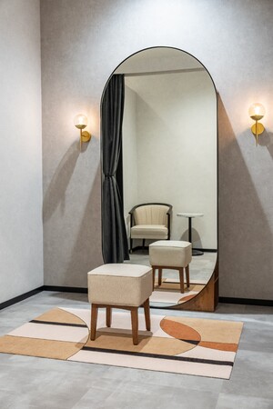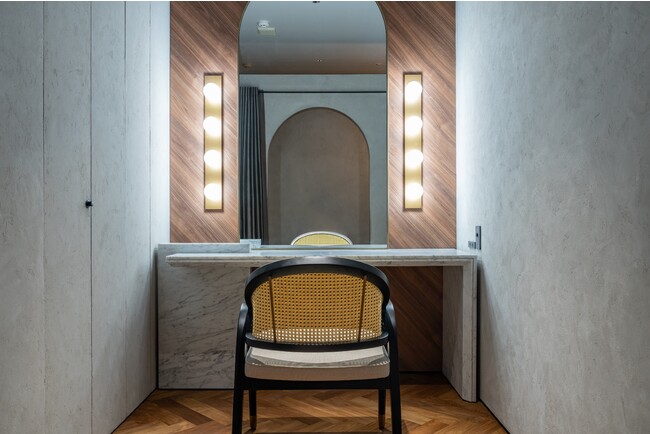 また、ドレスショップとしては珍しい本格的な美容ルームを設けたことで、館内でのヘアメイクリハーサルが可能になりました。ひとつの空間で、ドレスと美容という花嫁の「美にまつわる全て」をお手伝いします。ヘアメイクスタッフの利き手を問わないレイアウトを追求し、高いクオリティでのヘアメイクを実現。美容ルームの内装は居心地の良さも大切にし、ウェディングドレスフロアやフィッティングルームとは異なる、木の温もりが感じられる温かみのあるデザインにしています。