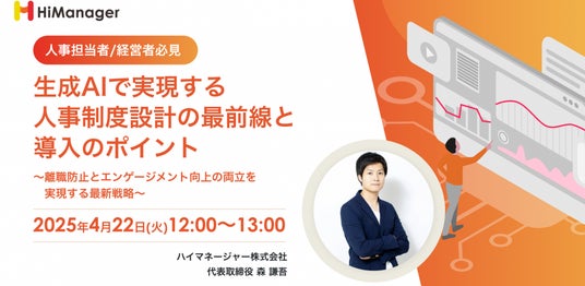 株式会社キュービック(本社:東京都新宿区、代表取締役社長:世一英仁、以下「キュービック」)のグループ会社、ハイマネージャー株式会社(本社:東京都渋谷区、代表取締役CEO:森謙吾、以下「ハイマネージャー」)は、2025年4月22日(火)に経営者・人事担当者向けオンラインセミナー「生成AIで実現する人事制度設計の最前線と導入のポイント~離職防止とエンゲージメント向上の両立を実現する最新戦略~」を開催します。人材の流動化や働き方の多様化が進む現代において、生成AIを活用した人事制度設計が、企業の成長と従業員のエンゲージメント向上に不可欠です。本セミナーでは、150社以上の人事コンサルティング実績を持つ当社が、具体的な成功事例や導入方法を徹底的に解説します。若手人材の早期離職やエンゲージメント低下に悩む企業に向けて、AI時代の新しい人事戦略をご提案します。