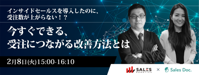株式会社イノベーション(マザーズ 証券コード3970)のグループ会社である、株式会社Innovation & Co.(本社:東京都渋谷区、代表取締役社長:遠藤俊一、以下「Innovation & Co.」は、SALES ROBOTICS株式会社(本社:東京都中央区、代表取締役CEO:内山雄輝、以下「SALES ROBOTICS」)と『インサイドセールスを導入したのに、受注数が上がらない?!今すぐできる、受注につながる改善方法とは』をテーマとしたセミナーを2022年2月8日(火)に開催します。