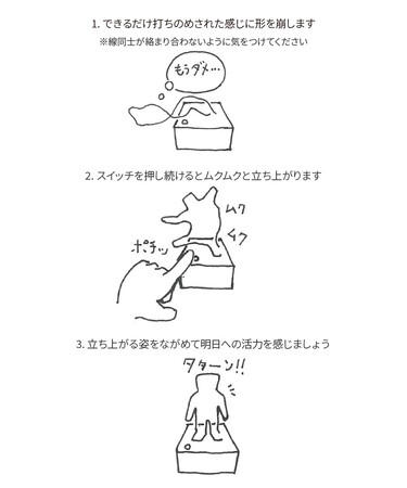 あそびかたは究極にシンプル。電池を入れて、「線人間」をグニャっとお好きな形に打ちのめしたら準備完了。スイッチを押し続けるとムクムクと立ち直ってきます。何度押しつぶされても立ち上がる健気な線人間の姿を眺めて明日への活力をほんの少しでも感じてもらえたら、そんな思いを込めています。