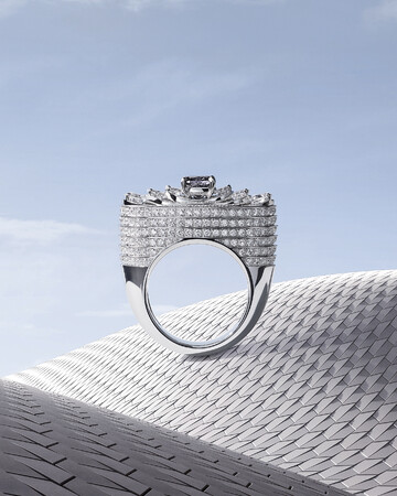 カルティエでは、すべてはストーンから始まり、感情も崇高な直観もストーンから生まれます。リングの中央で輝くのは0.92カラットのグレーバイオレットファンシー ダイヤモンド。バイオレットという希少な色調が際立つこのストーンを、カルティエは立体感とボリューム感がリズムを刻むミニチュア建築のような構図の中心に、まるで光の渦のように据えました。センターストーンを囲むようにハーフムーンのダイヤモンドが輝きを拡散し、ミステリアスな光の環がフォルムと輝きを引き立てます。