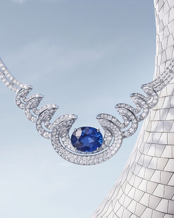 動きのないものに生命を吹き込み、「静」の状態から解き放つ、このクリエイションはまさにこの偉業を実現しました。19.27カラットのスリランカ産サファイアを中心に、インパクトの強い構図を配することで、はっとするような動きの感覚を生み出しています。ダルヴィーシュというイスラム神秘主義の修道僧がまとう僧服に着想を得たこのネックレスは、曲線とS字のカーブが連続した螺旋を描きます。ボリューム感のあるデザインにアラベスク模様が躍動を与え、その上で光が舞い踊ります。