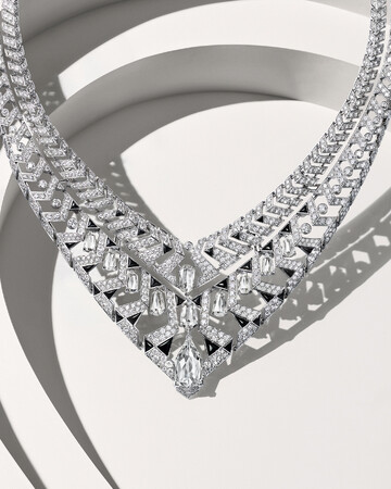 カルティエにとって、個性のあるストーンが完全にユニークなクリエイションの発想源になります。クロストラ ネックレスが引き立てるのは、全体を構成する“シールド”カットダイヤモンドです。なかでも、4.02カラットのひときわ目を見張る1石は、ジグザグのラインで構成される複雑な立体構造の中心に置かれています。遠近感と立体感が力を波及させながら互いに呼応することで、随所で光が振動し、拡散。幾度となく再解釈されてきたメゾンを象徴するコントラストを表現すべく、オニキスは透かし模様やダイヤモンドと交互に配されています。