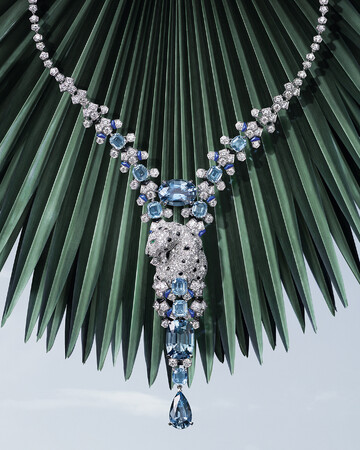 パンテール ジブレ ネックレスには、まさに様式化と具象化の対話が繰り広げられています。まず、パンテール ヘッドは、鼻先からアーモンド形のエメラルドの瞳、とがった耳まで写実的に表現。一方、毛並みは、幾何学的なオニキスの斑点をピクセルで表現しています。王者の風格を醸すパンテールは、強い発色を見せる合計20.33カラットの3つのアクアマリンの上であたりをじっと窺っているかのように見えます。繊細なラピスラズリのタッチが構図にリズムをもたらし、コントラストを演出します。