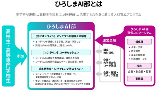 産学官が一体となり、高校生を対象に、AIを理解し活用する力を身に付ける機会を提供する人材育成プログラム「ひろしまAI部」の運営全般を担う。2024年4月に発足し、現在36の会員(企業、団体、行政・教育機関等)が参画している。