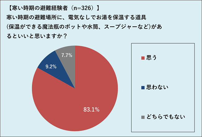 寒い時期の避難経験者の74%が、「寒い時期の避難場所で、お湯を必要とした」と回答しました。なかでも子どもと避難した人は、そのうち 88%が「寒い時期の避難場所で、お湯を必要とした」と回答しました。また、「寒い時期の避難場所に、電気なしでお湯を保温できる道具(保温ができる魔法瓶のポットや水筒、スープジャーなど)があるといいと思う」と回答した割合は、全体の約83%となりました。お湯の確保が課題となりやすい寒い時期では、避難時にお湯を保温できる魔法瓶製品のニーズは高いことが分かりました。