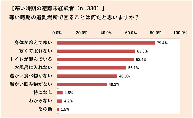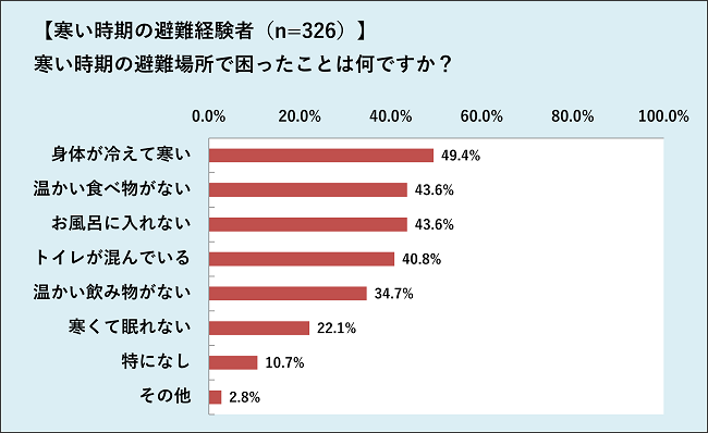「寒い時期の避難場所で困った/困ることは何ですか?」という質問に対し、未経験者が1位「身体が冷えて寒い」2位「寒くて眠れない」3位「トイレが混んでいる」だったのに対し、経験者は1位「身体が冷えて寒い」2位「あたたかい食べ物がない」「お風呂に入れない」となり、1位は同じであったものの2位以降は違いがあり、寒い時期の避難で困ることが想像と現実に大きな差がありました。