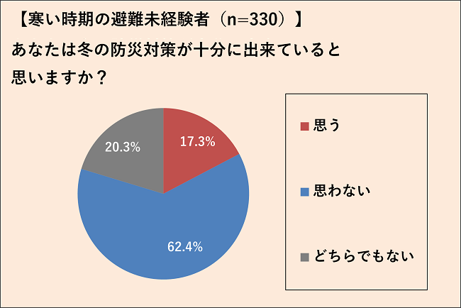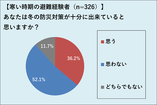 一方で「冬の防災対策が十分できている」と回答した割合は、寒い時期の避難経験者が36.2%、未経験者が17.3%となり、避難経験者の方が冬用の防災対策をしている人が約19%多いことが分かりました。このことから、寒い時期の避難経験を通して、寒い時期用の防災対策の必要性を実感した人が多いと予想されます。