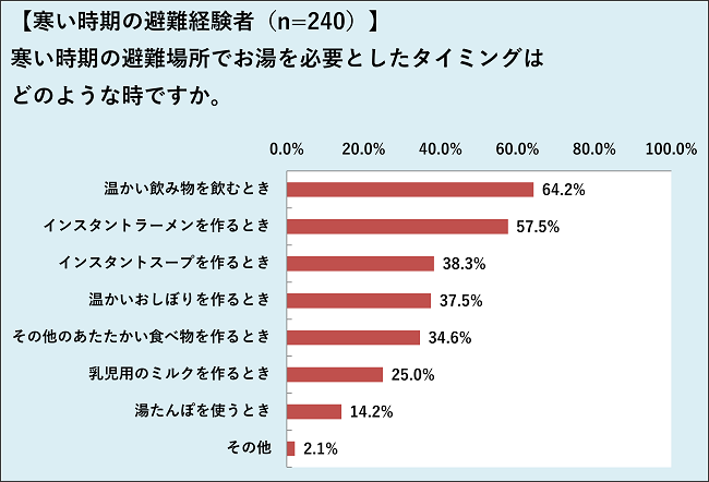 お湯を必要とした具体的なタイミングのTOP3は、「温かい飲み物を飲むとき」が64.2%、「インスタントラーメンを作るとき」57.5%、「インスタントスープを作るとき」38.3%となり、上位はすべて飲食に関わるタイミングとなりました。また、「温かいおしぼりを作るとき」も割合が高く37.5%となりました。「寒い時期の避難場所で困ったこと」を避難経験者に質問した際に、 「お風呂に入れない」の回答が2番目に多かったことを踏まえると、入浴替わりのケアなどで温かいおしぼりを必要とするタイミングが多かったものと推察されます。