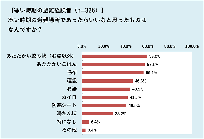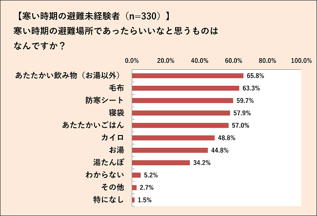 「寒い時期の避難場所であったらいいもの」は、避難経験者・未経験者ともに1位は「あたたかい飲み物(お湯以外)」でした。一方で2位以下は違いがあり、未経験者は2位「毛布」3位「防寒シート」だったのに対し、経験者は2位「あたたかいごはん」、3位「毛布」という結果になりました。実際に寒い時期の避難場所で求められるのは、あたたかいごはんや飲み物などの身体の内側から温まることができるものと分かりました。