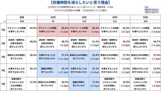 - - 世代別の特徴: 20代は「仕事をすることが好きではないから」、30代は「家族のための時間に充てたいから」が3位で、全体よりも高い結果。