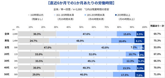 現在の労働時間の実態を知るため、正社員(フルタイム勤務)2,000名に、直近6か月における1か月あたりの労働時間を尋ねました。すると、「残業なし(月160時間未満)」が30.3%、「残業あり(月160時間以上)」が69.7%となりました。「残業あり」の内訳(※5)は、ひと月あたりの残業時間25時間未満が47.6%、45時間未満が15.6%、45時間以上が6.5%です。