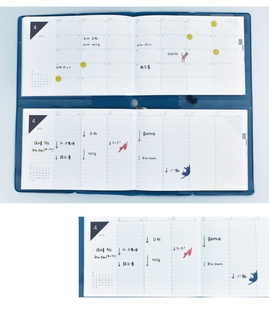 特長)手帳カバー上段に月間カレンダー、下段に日付フリーのデイリー手帳がセットされています。