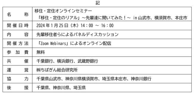 千葉銀行(頭取 米本 努)は、2024年1月25日(木)、「千葉・横浜パートナーシップ」を組むコンコルディア・フィナンシャルグループの横浜銀行(頭取 片岡 達也)および「千葉・武蔵野アライアンス」を組む武蔵野銀行(頭取 長堀 和正)と「移住・定住オンラインセミナー」を共催します。
