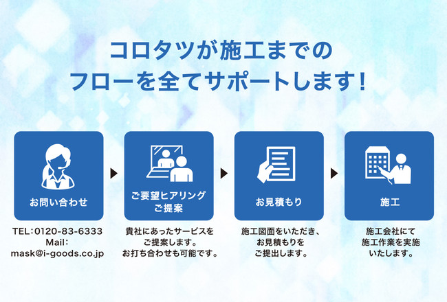 コロタツは一次代理店として、抗菌サービスの問い合わせ・ヒアリング・施行までの過程をフルサポート。また、コロタツはパーテーション・非接触検温器・アルコールディスペンサー・アルコール・マスク・使い捨て手袋・検査キットなどの感染症対策グッズも豊富にとりそろえているため、感染症対策グッズを含め感染症対策はまるっとコロタツにお任せいただけます。さまざまな会社に依頼する手間が省けます。