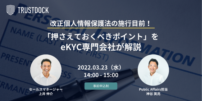 導入社数No.1(※)のeKYCオンライン本人確認サービスを提供する株式会社TRUSTDOCK(本社:東京都千代田区、代表取締役:千葉 孝浩、以下 TRUSTDOCK)は、2022年4月に施行される改正個人情報保護法をテーマに、「改正個人情報保護法の施行を目前!押さえておくべきポイントをeKYC専門会社が解説」と題したウェビナーを2022年3月23日(水)に開催いたします。