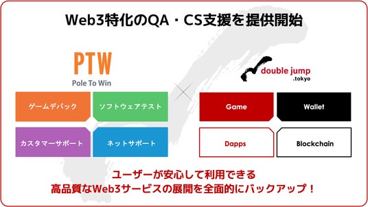 ブロックチェーン技術を用いたアプリケーション開発を行うdouble jump.tokyo株式会社(本社:東京都新宿区、代表取締役:上野広伸・満足亮、以下「double jump.tokyo」)は、ポールトゥウィンホールディングス株式会社(本社:東京都新宿区、代表取締役社長:橘 鉄平、証券コード:3657、以下「PHD」)から資金調達を実施致しました。それに伴い、PHDの子会社で30年以上の運用経験と30,000タイトル以上のデバッグ・ノウハウを持つポールトゥウィン株式会社(本社:愛知県名古屋市、代表取締役 CEO:橘 鉄平、代表取締役 COO:志村 和昭、以下「ポールトゥウィン」)とパートナーシップを組み、「Web3トータルサポート(仮)」を開始します。このサービスを活用することで、ブロックチェーン技術を使ったWeb3サービスやプロダクトの品質向上と開発プロセスの効率化、ユーザー体験の向上が期待されます。