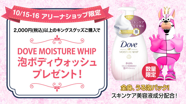 アリーナショップでは試合観戦に欠かせない応援グッズから日常生活でも使える小物まで幅広い商品を販売中!さらに「KINGS LADIES DAY」の2日間限定で、アリーナショップにて2,000円以上ご購入いただいた方に先着500名様限定で「DOVE MOISTURE WHIP 泡ボディウォッシュ」をプレゼント!この機会にぜひ、アリーナショップにお立ち寄りください!