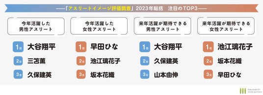 「来年活躍が期待できる」アスリートは、男性で1位:大谷翔平(MLB・大リーグ)、2位:久保建英(海外サッカー)、3位:山本由伸(プロ野球<国内>)、4位:三笘薫(海外サッカー)、5位:井上尚弥(ボクシング)となりました。女性は1位:池江璃花子(水泳<競泳>)、2位:坂本花織(フィギュアスケート)、3位:早田ひな(卓球)、4位:大坂なおみ(テニス)、5位:紀平梨花(フィギュアスケート)/張本美和(卓球)となりました。