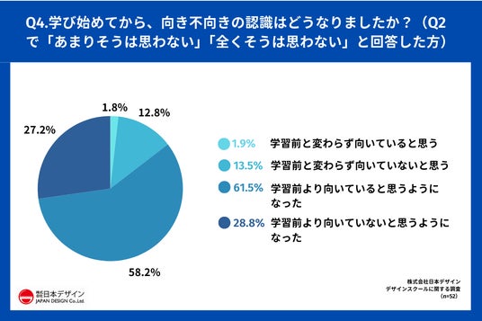 さらに、「自分はWEBデザイナーに向いていると思っていましたか?」という質問で「あまりそうは思わない」「全くそうは思わない」と答えた人に至っては61.5%の人が「学習前より向いていると思うようになった」と回答しました。