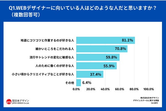 「Q.WEBデザイナーに向いている人はどのような人だと思いますか?(複数回答可)」(n=281)と質問したところ、81.1%もの人が「地味にコツコツと作業するのが好きな人」と回答しました。「細かいところをこだわれる人」という回答も70.8%ありました。