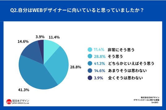 「Q.自分はWEBデザイナーに向いていると思っていましたか?」(n=281)と質問したところ、81.4%が「非常にそう思う」「そう思う」「どちらかといえばそう思う」と回答した。