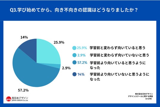 「Q.学び始めてから、向き不向きの認識はどうなりましたか?」(n=278)と質問したところ、57.2%が「学習前より向いていると思うようになった」と回答した。