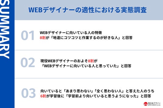 今回の調査によりWEBデザイナーに必要な適性は、センスや生い立ちなどの変えられないものよりも、「地道にコツコツと作業するのが好きな人」「細かいところをこだわれる人」など、誰にでも変えられる姿勢などであることがわかりました。
