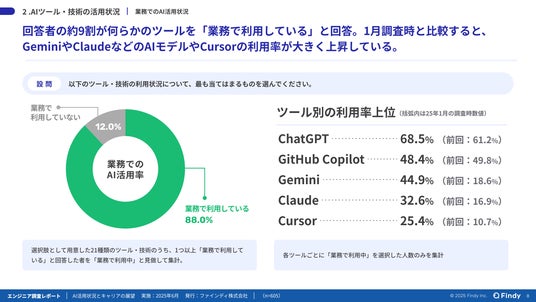 また企業側にも変化がみられます。企業向け調査では、「AI活用・導入を推進する人材の採用に積極的」と答えた企業は50%にのぼりました。生成AIを実務で使いこなし、プロダクト開発・事業を牽引できる人材への需要が高まっています。