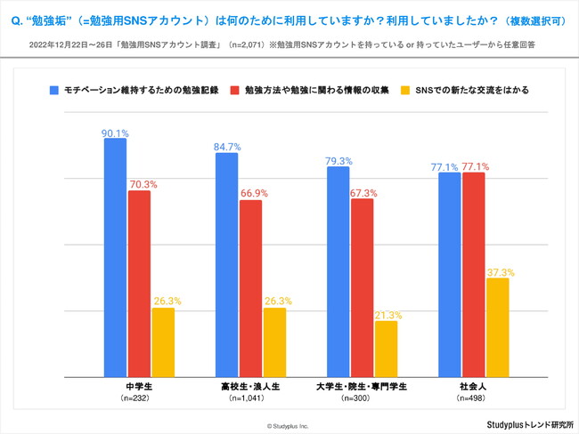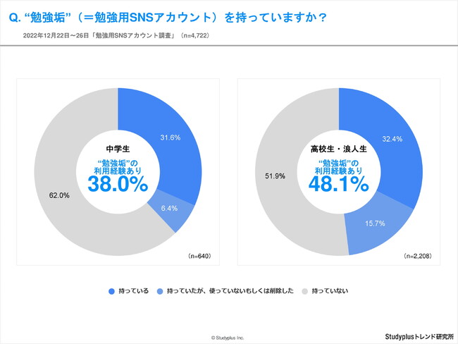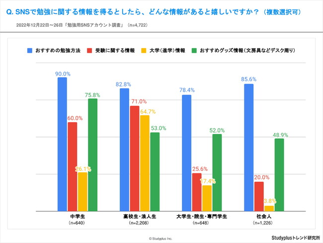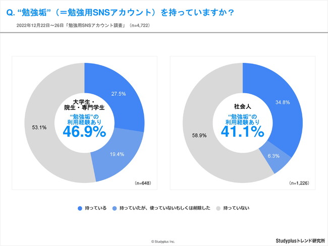 スタディプラス株式会社(本社:東京都千代田区、代表取締役:廣瀬高志、以下スタディプラス)のStudyplusトレンド研究所は、2022年12月22日(木)から12月26日(月)にかけて、学習管理アプリ「Studyplus」上で全ユーザーを対象に「勉強用SNSアカウント調査」を実施、中学生・高校生・大学生・社会人等のユーザー4,722名から調査に対する回答を得ましたので結果をご報告します。