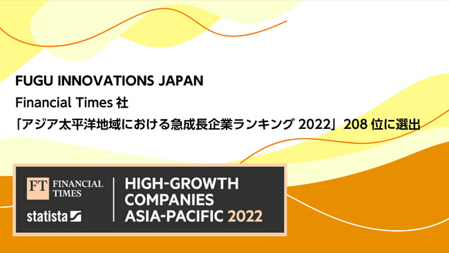 株式会社FUGU INNOVATIONS JAPANは、Financial Times社とStatista社が共同で実施した、アジア太平洋地域における急成長企業ランキングトップ500社を選出する「FT ranking: High-Growth Companies Asia-Pacific 2022(アジア太平洋地域における急成長企業ランキング2022)」において、208位にランクインいたしましたので、お知らせします。
