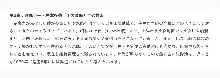 比良山地東麓における自然がもたらす恵みと災いの相互の関わり、そして、災いを避け、災害復旧してきた人々の知恵や技術の蓄積について、様々な分野のプロジェクトメンバーが、やさしく紹介しています。