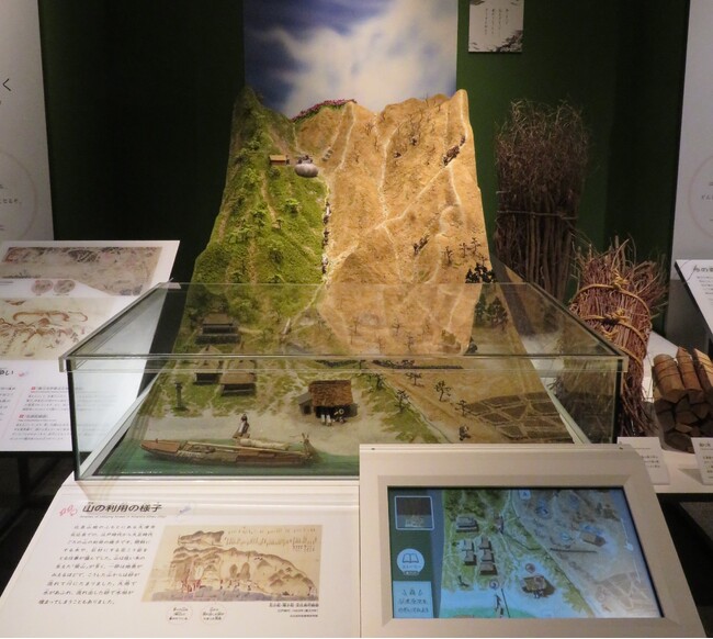 琵琶湖博物館B展示室にある「山の利用ジオラマ」は、本書第4章・第8章に関わる調査をもとに、大津市北比良地区をモデルとして作製しています。ジオラマでは、石材や燃料用のアカマツ林の採取、その結果、土砂の流出という災いと付き合いながら自然の恵みを得ていた様子を再現し、聞き取りで得られた情報をもとに、デジタル端末で解説しています。本書をお読みいただくと、ジオラマに再現された比良山麓の景観の詳しい状況や歴史的文脈がわかります。