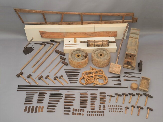本書で紹介されている大津市北比良地区で石工の「親方」をつとめた家から寄贈された「北比良の石屋用具」1,112点(2023年(令和5年)3月17日、滋賀県有形民俗文化財に指定)は、当館に収蔵されています。比良山麓地域における石材の生産活動の全体がよくわかる資料群で、当館で整理をおこなって大切に保管しています。上記「山の利用ジオラマ」でもその道具のいくつかが再現されています。