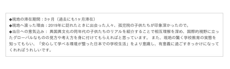 新型コロナウイルスの影響で、修学旅行や社会科見学など外部から学びを得る機会が減ってしまった学校も多く、非常に遺憾に思っております。ニットの世界各国にいるメンバーとオンラインでつなぎ、高校生たちが現地の様子をリアルタイムで感じることで、高い興味関心を持って主体的・対話的で深い学びの視点からの効果的な授業を提供していくことを目指します。