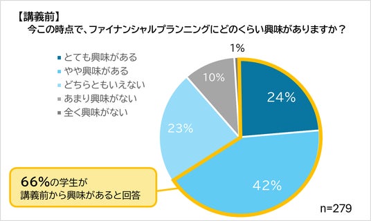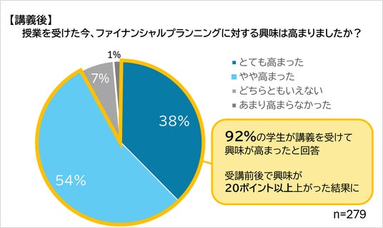 講義前に「ファイナンシャルプランニング」への興味を聞いたところ、66%の学生が「興味がある」と回答。また、受講後にも「ファイナンシャルプランニング」に対する興味が高まったか聞いたところ、参加した学生の92%が「高まった」と回答し、受講前後で26ポイント上がる結果となりました。