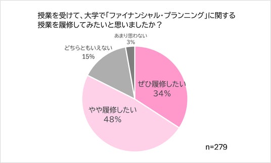 また、同志社女子大学でファイナンシャルプランニングに関する授業が来年度から開始されるため、履修に対する質問をしたところ、「ぜひ履修したい」が34%、「やや履修したい」が48%と約8割の学生が「履修をしてみたい」と回答し、自助努力が求められる時代を生きていく学生にとって需要があることが示唆されます。