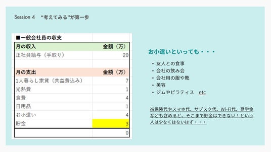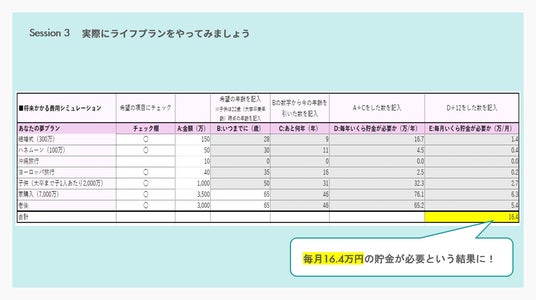 ・実際に自分が結婚式を挙げたい年齢や老後の費用などを具体的な数字で計算することで、将来お金がいくら必要になるのかを見ることができた。思った以上にお金がないと生活が厳しくなる現実に気がついた。