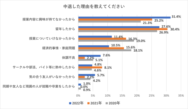 中退理由について質問したところ、1位:「授業内容に興味が持てなかったから」、2位:「留年したから」、3位「授業についていけなかったから」となりました。「授業内容に興味が持てなかったから」の回答は、2020年の結果と比較すると10.1ポイント、2021年の結果と比較すると6.2ポイント増加し、これまで2年連続で1位だった「留年したから」を上回り、初めての1位となりました。