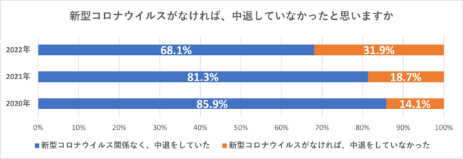 また「新型コロナウイルスがなければ、中退していなかったと思いますか」と質問したところ、「新型コロナウイルスがなければ、中退していなかった」の回答は、2020年は14.1%、2021年は18.7%、2022年は31.9%と、2022年は2021年と比較し、13.2ポイント増加しています。中退理由において、「経済的事情・家庭問題」の回答は年々減少傾向にあることから、コロナ禍になり約3年が経過する今、中退に至った理由は、経済的影響以上に、オンライン授業や留学の中止など、学習面での影響が増加していることが考えられます。