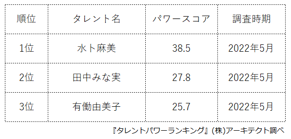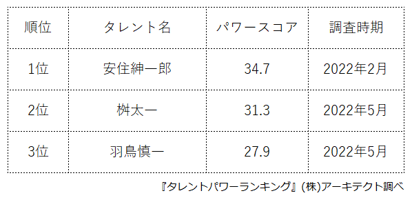 本ランキングは、2022年5月度に実施したタレント調査データ(一部過去実施データ)を利用し、タイトルに応じてランキング形式でまとめたものです。