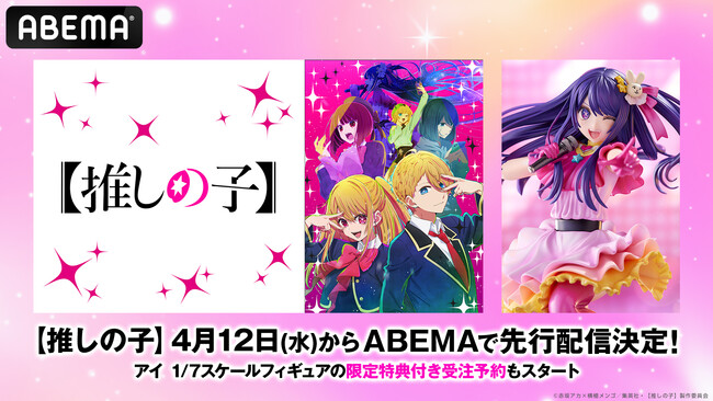 新しい未来のテレビ「ABEMA」は、アニメ作品のオフィシャルグッズを販売する公式ストア『ABEMA Mart アニメ!』(読み:アベマート アニメ)にて、2023年4月12日(水)夜24時30分より「【推しの子】 アイ 1/7スケールフィギュア」の受注予約を開始することをお知らせいたします。また、同日4月12日(水)夜11時より、TVアニメ『【推しの子】』の「ABEMA」地上波同時・単独最速配信を開始いたします。