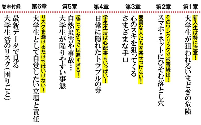 SNSやスマホのトラブル、カルトからの勧誘、ブラックバイト、自転車事故、飲酒トラブル、大地震・豪雨… “知らなかった”でせっかくの大学生活を台無しにしない、学生と親のための安全・安心マニュアル決定版!イザという時の相談窓口も掲載していて超お役立ちの一冊。