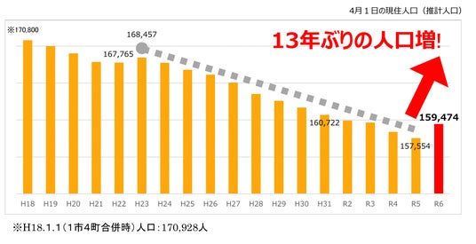 今回、令和6年4月1日現在の現住人口(推計人口)が159,474人となり、前年同月比で1,920人の増加となり、同月比では13年ぶりの人口増を実現しました。