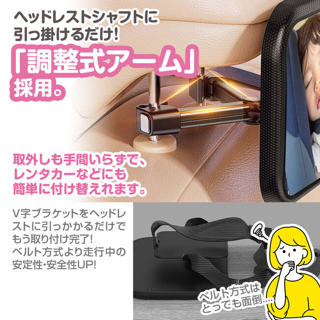 ヘッドレストに引っ掛けるだけの簡単設置「調整式アーム」を採用。