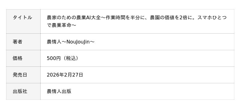 農業の課題解決を支援する株式会社農情人(本社:千葉県船橋市、代表取締役:甲斐雄一郎)は、農業現場における生成AIの実装手順を体系化した書籍『農家のための農業AI大全』を、2026年2月27日(金)よりAmazon Kindleストアにて発売いたします。