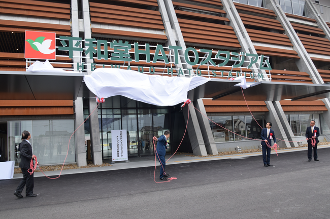 9時30分からスタートした記念式典では、滋賀県知事三日月大造様をはじめとする関係者がテープカットを行い、続いて「平和堂HATOスタジアム」の除幕式が行われました。